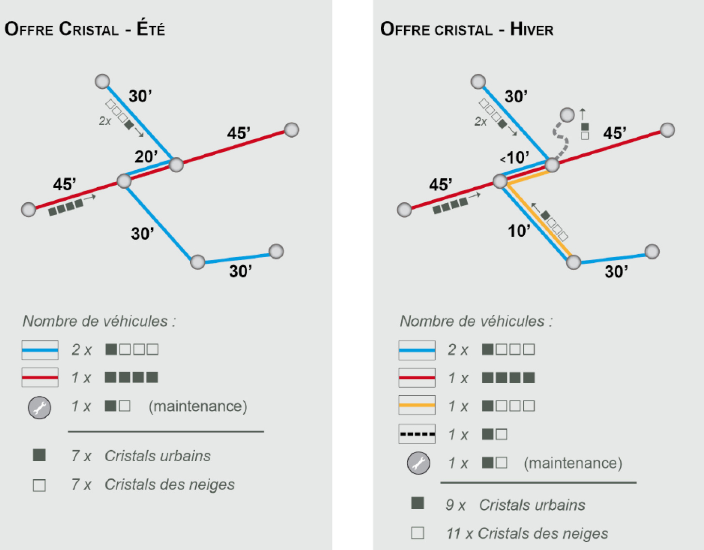 Cristal est un véhicule de transport public routier, 100% électrique, compact et modulable, pouvant circuler en convoi d’un à trois véhicules. Il est disponible en version  » Cristal des neiges  » pour le transport de skieurs, avec des remorques motorisées sans poste de pilotage.